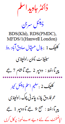 | CLINIC 1bilal hospital 38-a sadiqabad road satellite town rawalpindiMonday to Saturday 2.00 PM to 7.00 PM Landline: 051 4573622 Cell: 0323 6663422 | CLINIC 2Saleem Aslam Dental CareUmer Farooq Plaza Chandni Chowk, RawalpindiMonday to Saturday 9.00 AM to 1.00 PM Landline: 051 4927428 Cell: 0336 6663422 |